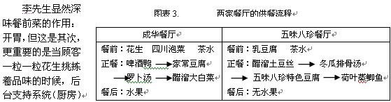 成华餐厅、五味八珍餐厅都是座落于成都市成华区的餐厅。一日,我与我们的咨询客户正巧在五味八珍餐厅就餐,客户表示难以理解战略、市场、流程、组织四者之间的关系,我于是将这一简单而智慧四射的供餐流程与之分享(如图表3)。