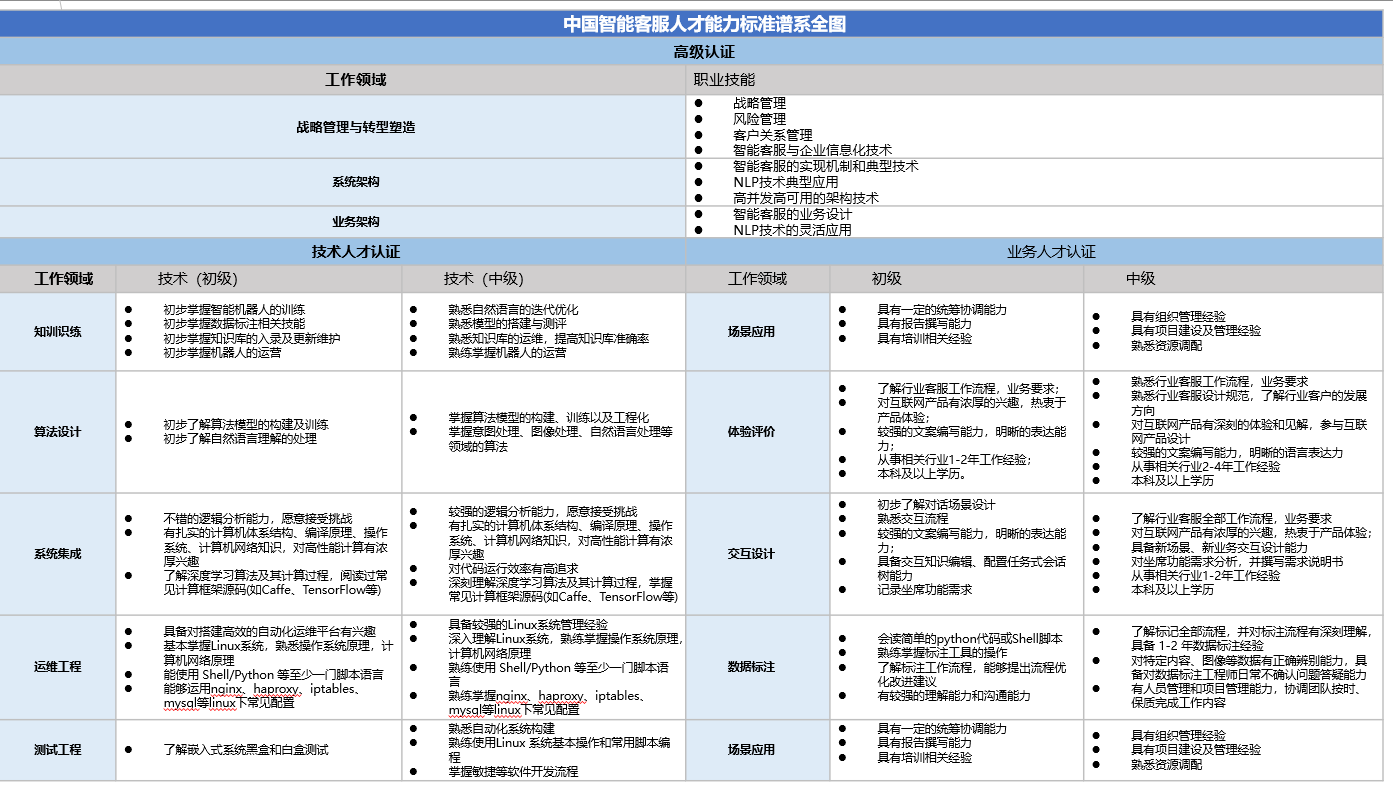 但与智能客服市场快速发展相比,我国人工智能相关人才紧缺度还是非常突显,现存技术人才不能满足爆发增长的产业岗位需求。因此,研究人工智能相关技术人才认证体系变的迫在眉睫。2019年5月27日下午,由百度智能云发起,联合智能客服产业链上下游机构,在京举行专题研讨会,同意成立“中国智能客服专业人才认证标准联盟”,并就联盟定位、运行机制、智能客服专业人才岗位谱系等展开讨论。同时,会上针对智能客服岗位谱系及其“智能客服专业人才认证”体系架构,与会企业、专家根据各自实践经验,取得初步共识,即将智能客服专业人才分为初中高三个层级,其中初级与中级两个层级分为专业人才和技术人才,而在高级人才,考虑到其能力要求的全面性、综合性,将其合并为一个“智能客服专业人才(高级)”。同时,业务人才核心能力界定为场景应用、体验评价、交互设计、数据标注等四个方面,技术人才的核心能力界定为知识训练、算法设计、系统集成、运维工程、测试工程等五个方面(图4)。