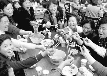 江西赣州市章贡区西津路社区邻里关系和谐融洽,居民们经常聚在一起举办形式多样的活动。图为在该社区组织的“团团圆圆饺子宴”上,100多户居民欢聚一堂,一起包饺子,吃饺子。