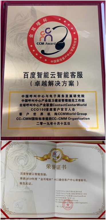 百度智能云智能客服荣膺2019“金耳唛杯”中国最佳客户中心殊荣
