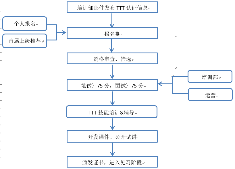 若一个员工具备了上述任职资格条件后,只是说ta是一名潜在的内训师。若想真正能够站在讲台前授课,还需要经过一系列的训练。接下来,我们就来看看内训师的认证流程。