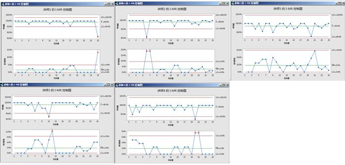 如图3的例子,在这5个讲师中,讲师5的授课状态波动起伏最大;讲师1、讲师2、讲师4的授课状态都还算平稳;讲师3有过一次改善过程。(具体分析过程可参看笔者的公众号“天飓”文章“用数据来评价内训师”)