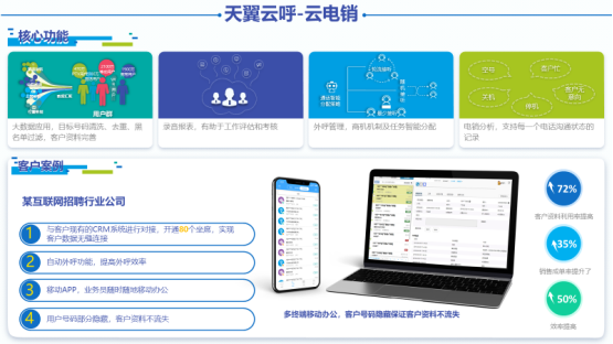 具备大数据应用,目标号码清洗、去重、黑名单过滤,录音报表,外呼管理,电销分析等多种核心功能,拥有灵活部署个性化可定制,客户资源优化分配,大数据智能过滤等产品优势,为某互联网招聘龙头企业提供了系统客户数据的无缝连接,提供自动外呼功能有效提高外呼效率高达50%,同时针对用户号码部分隐藏,保证客户资料不流失,提高客户资料利用率达72%。