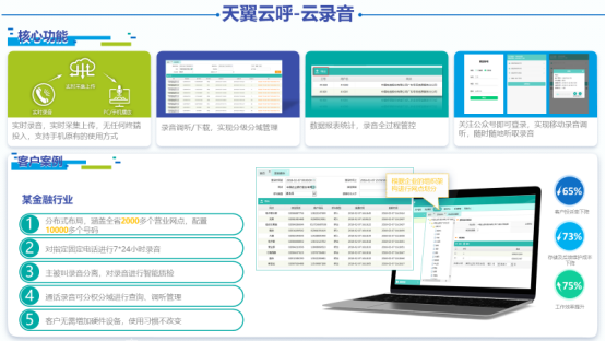 具备实时录音、录音调听/下载,数据报表统计、移动接听等核心功能,客户零投入/零维护/领改造,提供电信级保障安全可靠,为某金融行业客户提供配置10000多个号码的分布式布局,对指定号码进行7*24小时录音,主被叫录音分离,对录音进行智能质检,无需增加硬件设备即可使用,大大降低了客户的投诉率达65%,储存及维护成本下降了73%,工作效率提升了75%。