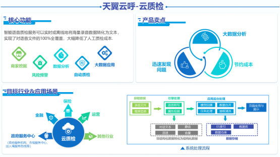具备自动质检、数据分析、风险预警、商机挖掘等多种核心功能,有效节约成本,具备效率高时效性强的特点,并可进行大数据分析为客户、运营、营销等提供有效的数据支撑。