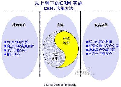 良好的CRM实施方法是从上到下的。也就是说,在企业内部的高层支持和直接参与下,实施小组制定出CRM目标、客户价值分类的依据,并动员相关部门为整个项目投入精力和资源,实现内部和外部的转变,最后才能达到客户和企业的双赢效果。整个过程如下图所示: