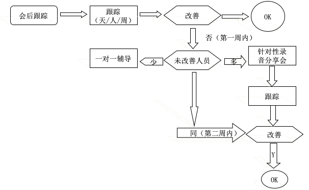 往往我们很多质检人员只注重录音分析会的过程效果,却忘了会后跟踪的重要性。事实证明,会后跟踪比前期的录音分析更重要,我们可以通过一周的观察期,针对重点关注人员通过录音抽听的方式,分析员工是否有改善,没有改善的员工要回炉辅导,持续沟通直至员工服务质量得到提升,做好服务质量提升工作的问题闭环。