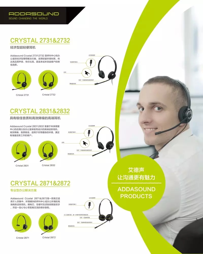 艾德声现有获得呼叫中心行业广泛认可的Crystal系列话务耳麦。该系列旨在为呼叫中心坐席人员提供更加高效舒适的体验,有效降低沟通成本,提升服务效率。目前主推的有经济型Crystal 2731&2732、舒适型Crystal 2831&2832以及专业型Crystal 2871&2872。
