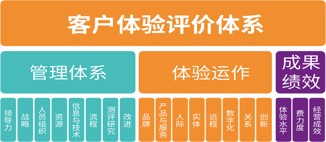 如附图所示,客户体验评价体系从客户体验的管理体系、体验运作、成果绩效三个方面对组织的客户体验进行评价。