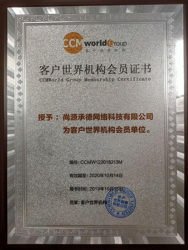 2019年10月15日,借举办“2019第十五届客户世界年度大会”的契机,尚源承德网络科技有限公司正式成为客户世界2019/2020年度企业会员。