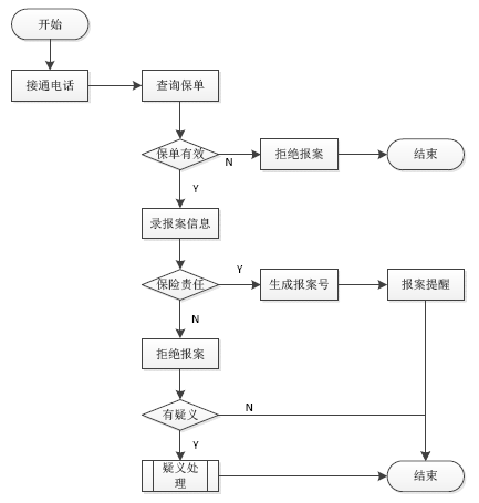按照上述两个角度,把接报案业务的流程调整为下图所示的样子,从图上可以看出有四个步骤在某些情况下变成不需要记录了。