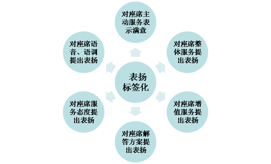 通过对表扬历史数据进行分析归纳,总结出客户提出表扬度共同点,多是对员工服务态度的认可、对员工提供解决方案的认可或是对员工的增值服务等方面的认可。可将客户表扬问题进行标签化归纳为: