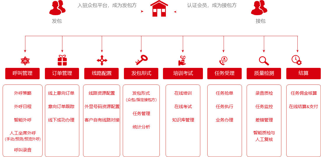 众包平台是中国东信打造的互联网化的呼叫中心平台,平台采用互联网众包模式,有呼叫业务需求的企业客户可以在众包平台上发布任务,同时,平台接入了分布在全国的大量呼叫中心服务商,服务商负责组织海量的呼叫坐席在平台上进行抢单作业。通过众包模式,平台实现了呼叫中心行业的集约化管理,并能够有效的调用全国的外呼生产力,极大的提升了整个行业的服务效率。同时,平台的一站式统一管理,为上下游企业客户提供了各种自动化的管理工具和智能化的服务工具,减轻了企业客户的业务管理负担,能够为广大企业用户实现提效降本的目标。