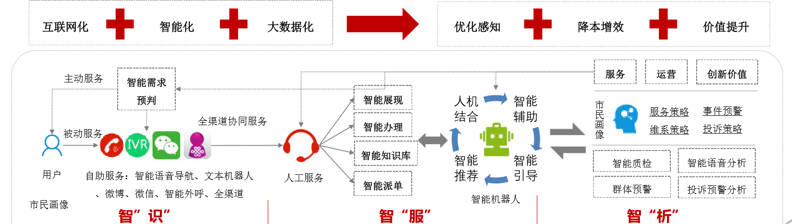 为解决12333原有系统在系统建设和业务开展方面存在一些问题,中国东信基于云坐席平台为广西人社厅打造了广西12333热线智能化全渠道客服平台。通过大数据分析,进行市民画像智能识别并预判市民需求,提供智能化语音导航、机器人等支撑;通过提供智能工作台、人工智能等辅助客服代表,随着市民需求在服务过程中进行灵活服务组合;利用语音识别、 文本分析等大数据手段 ,提升运营分析水平,创新市民服务价值。