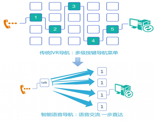 其中智能对话可以实现简单场景下的人机互动,能够解决企业客户一般简单场景下的智能对话需求。智能导航是为企业客户提供的区别于传统IVR的高效语音导航能力,用户可以直接通过语音描述自己的需求,后台会根据客户的需求智能化返回查询结果。