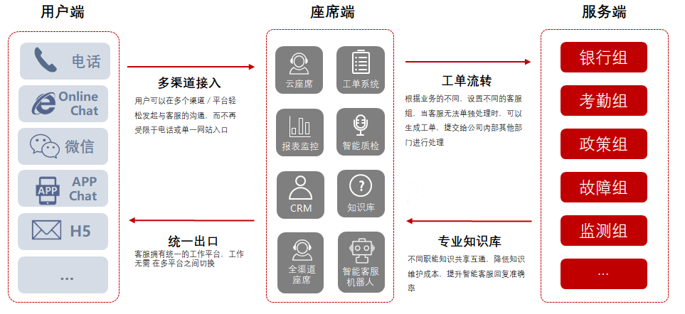 产品总体完成众包平台、智能客服平台、云坐席平台三大平台的建设,实现呼入、呼出、在线客服的全场景一站式服务。