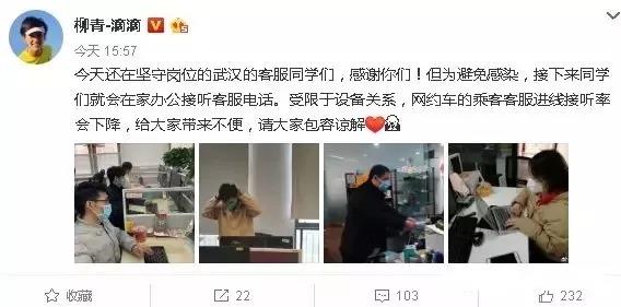 各大企业也在新肺疫情期间积极行动,滴滴公司总裁柳青提议让客服回家办公,接听客服电话为用户提供服务,并感谢坚守在武汉的客服同事。