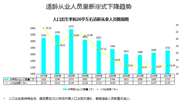 从人口出生率来看,自2000年开始,适龄工作人群数量大幅下降,之后每年的下降数量稳定在1500-1700万。近五年人口出生率的统计分析,未来5-10年,中国适龄劳动力可能进入新低谷。人力稀缺、培养成本高,使得客服产能短缺问题日益严峻。