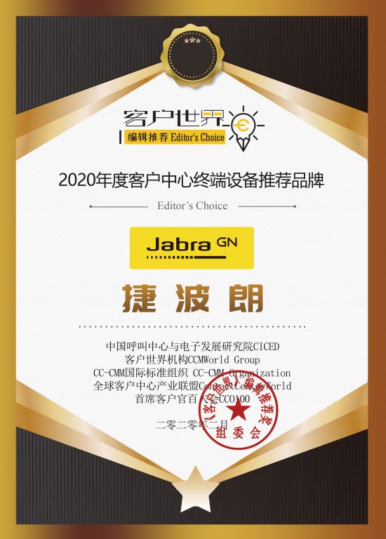 转载请注明来源:捷波朗(Jabra)荣登《客户世界》2020年度编辑推荐:客户中心终端设备推荐品牌榜