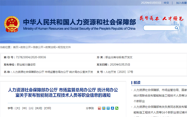文件称:根据《中华人民共和国劳动法》有关规定,为贯彻落实《国务院关于推行终身职业技能培训制度的意见》提出的“紧跟新技术、新职业发展变化,建立职业分类动态调整机制,加快职业标准开发工作”要求,加快构建与国际接轨、符合我国国情的现代职业分类体系,我们面向社会持续公开征集新职业信息。经专家评估论证、公示征求意见等程序,目前遴选确定了智能制造工程技术人员等16个新职业信息,调整变更了11个职业信息,现予发布。