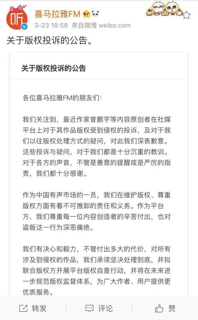 今年3月喜马拉雅FM就曾因平台上出现未授权的有声书而被作者提起诉讼,类似的事件在行业内并不少见。对这些平台而言,尽管它们搭建了版权审核体系,并不断地扩充自己的版权库,但这样的侵权事件仍然防不胜防。