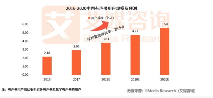 但无论如何,整个有声书市场仍然呈现着蓬勃向上的趋势,根据艾媒咨询的数据,有声书市场用户规模目前为2.96亿,预计还会以年均符合增长率26.5%的速度继续增长,到2020年,有声书市场的用户规模有望达到5.59亿。