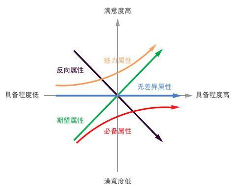 从图1可以看出,狩野纪昭教授将影响满意度的因素划分为五个类型:基本(必备)型需求,期望(意愿)型需求,兴奋(魅力)型需求,无差异型需求,反向(逆向)型需求。 图表中:竖坐标代表客户满意度,自下而上满意度越来越高,横坐标代表产品质量,从左到右表示产品质量越来越好。通过五种不同颜色的线条来反映五种不同的客户需求在质量和满意度之间的流动关系。