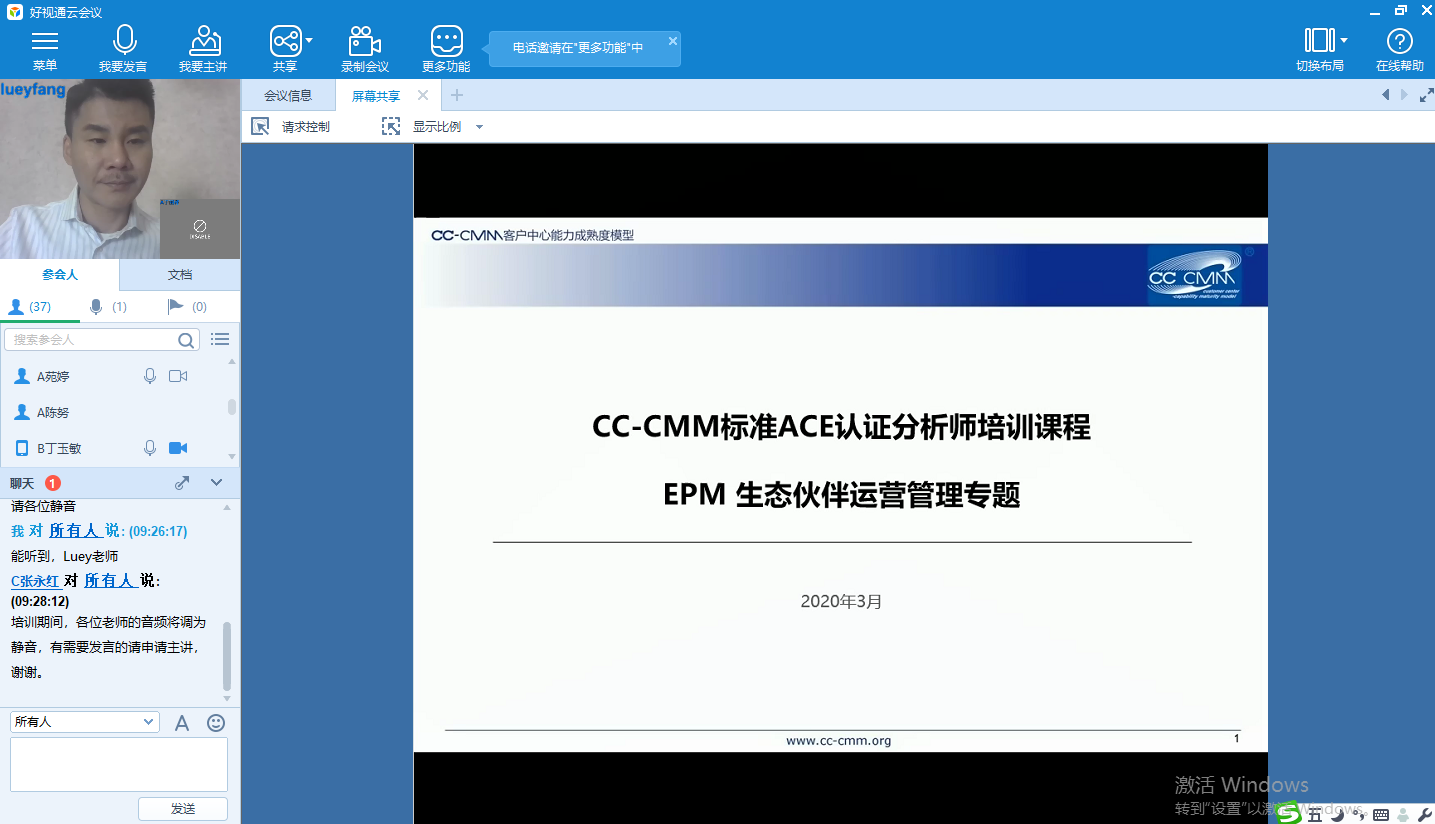 由于新冠疫情的影响,本次培训全程采用远程视频的方式进行。培训导师由CC-CMM国际标准组织 EPM首席顾问方俊雄老师、CC-CMM国际标准组织业务总监严晶老师共同担纲主讲。参训学员超过五十位,分别来自:中电智恒、华讯禾盛、优服邦、中国电信广东公司、中信银行信用卡中心客服部95558客服中心(北京)、北京政信1890、医护到家、百望科技、南昌市政公用集团96166客服中心、百果园客服中心、蓝润地产客服中心等单位。