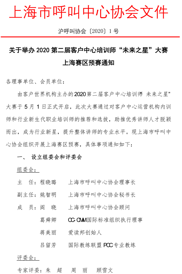 4月30日,客户世界消息:今日,上海市呼叫中心协会发布文件{沪呼叫协会〔2020〕1 号},宣布正式启动2020第二届客户中心培训师“未来之星”大赛-上海赛区比赛。