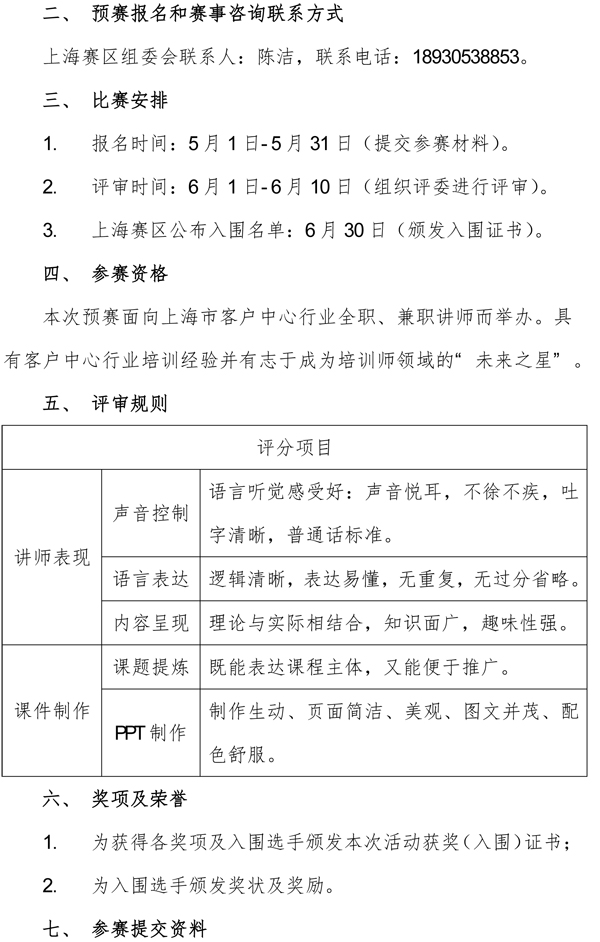 由客户世界机构主办的2020第二届客户中心培训师“未来之星”大赛于5 月1 日正式开启,此次大赛通过对客户中心运营机构内训师和行业新生代职业培训师的推荐和选拔,助推优秀讲师人才脱颖而出,成为行业新星,提升整体讲师的专业水平。现上海市呼叫中心协会组织开展上海赛区预赛,具体事项通知如下:
