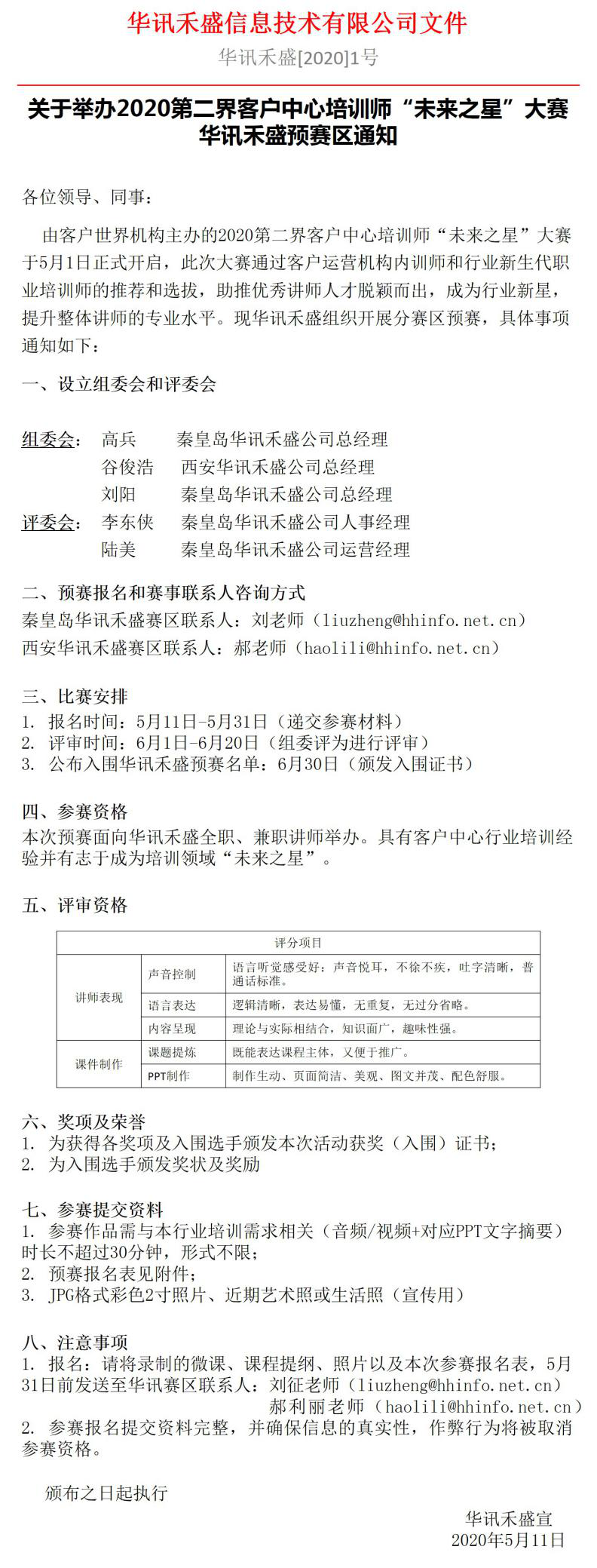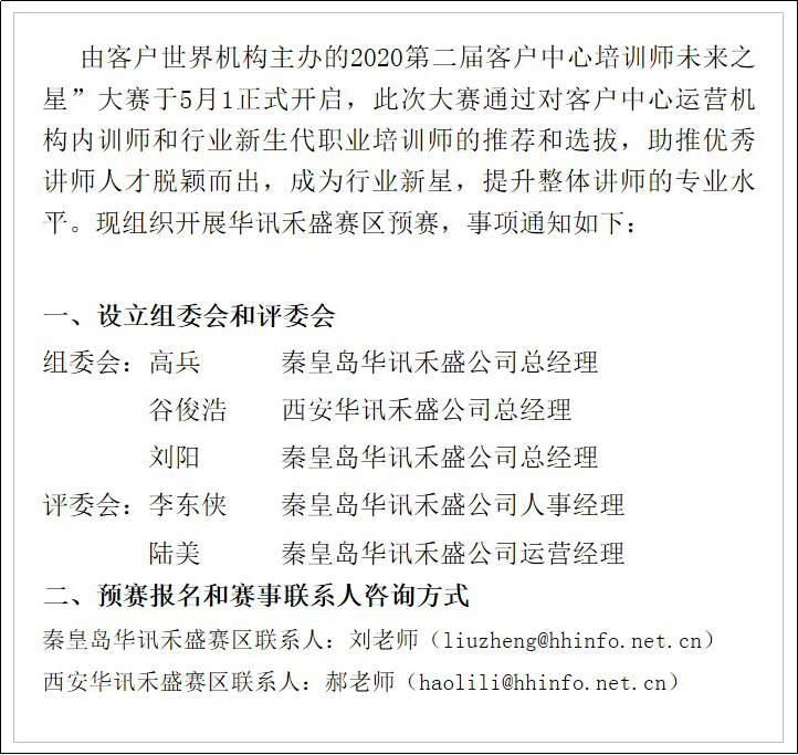 5月11日,客户世界消息:今日,华讯禾盛宣布正式启动2020第二届客户中心培训师“未来之星”大赛分赛区比赛。