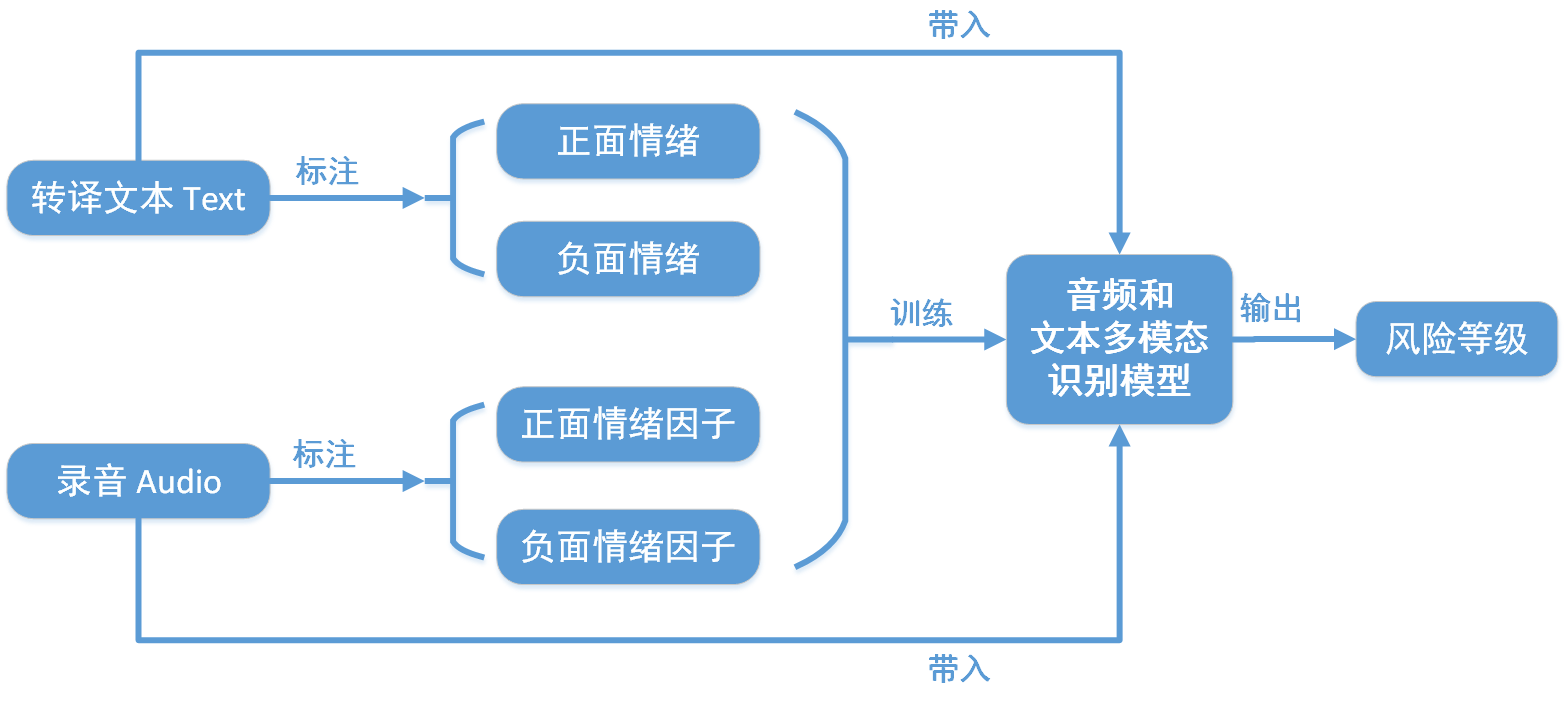在服务投诉属实事件后续跟踪访谈中发现,有至少1/3的客服人员表示受客户异常情绪影响,无法在服务过程中以积极的心态受理业务,最终引发客户不满情绪升级,造成投诉事件。跟踪数据表明,客服自身负面情绪和客户异常情绪对整个交互过程产生着重要影响,基于文本分类算法技术,将服务投诉属实事件的录音和转译文本作为负样本训练数据,将质检后无服务差错或缺失的录音和转译文本作为正样本训练数据,质量专家结合上下文对正、负样本内句子级的颗粒进行正、负面情感类的标注,同时对录音中语音情感进行跟踪,在交互过程中出现急躁情绪(急躁因子)时一般表现为语速变快、音量也会突然升高,语音中的情感特征可以通过语速、字频、语调以及声音能量的大小等韵律特征变化进行体现,同时结合语音的频次、发声概率、响度轮廓等变化特点来抓取能够体现语音情感特征的参数,与此同时收集非情感类语句的参数进行两类对比,总结出各个特征参数的变化规律(图2)。在正、负两类数据标注的基础之上利用textCNN等深度学习算法,构建音频和文本的多模态识别模型,并对其输出结果进行风险等级的划分(图3)。