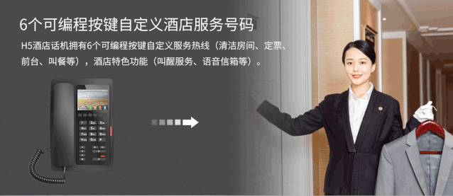 为更好地迎合不同酒店的装修风格,方位推出全新白色H3/H5酒店IP话机。方位白色H3/H5酒店IP话机采用优雅的白色外观,为客户带来耳目一新的视觉享受。除此之外,还拥有1个USB充电口可以为手机/平板电脑等设备充电;1个3.5英寸彩色屏幕可直观的显示酒店信息(H5),有助于提升酒店形象;配备6个可编程速拨按键,可根据酒店需求自定义酒店客房服务热线,方便客人快速获取相关服务,提高客人的入住舒适感。
