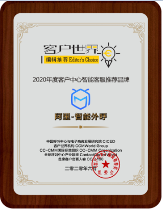 阿里巴巴智能外呼机器人荣获《客户世界》编辑推荐:2020年度“智能客服”推荐品牌。