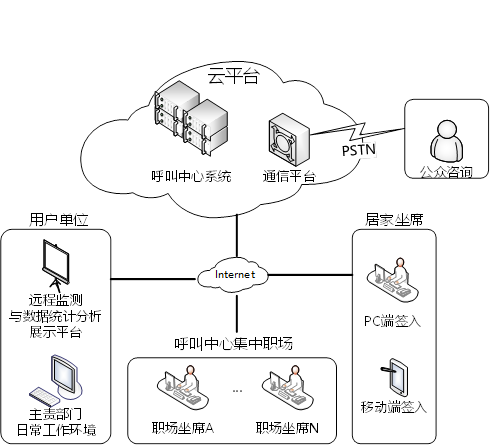 图1 全渠道智能云呼叫中心系统和居家座席网络拓扑结构