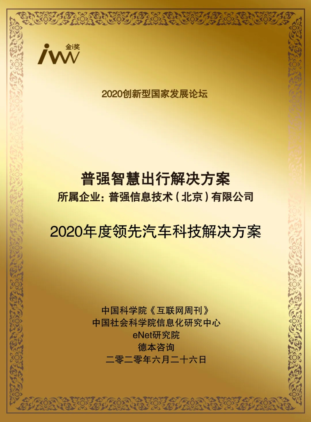 6月27日,经过层层评选,2020创新型国家发展论坛解决方案奖评选结果正式公布,“普强智慧出行解决方案”获“2020年度领先汽车科技解决方案”奖。
