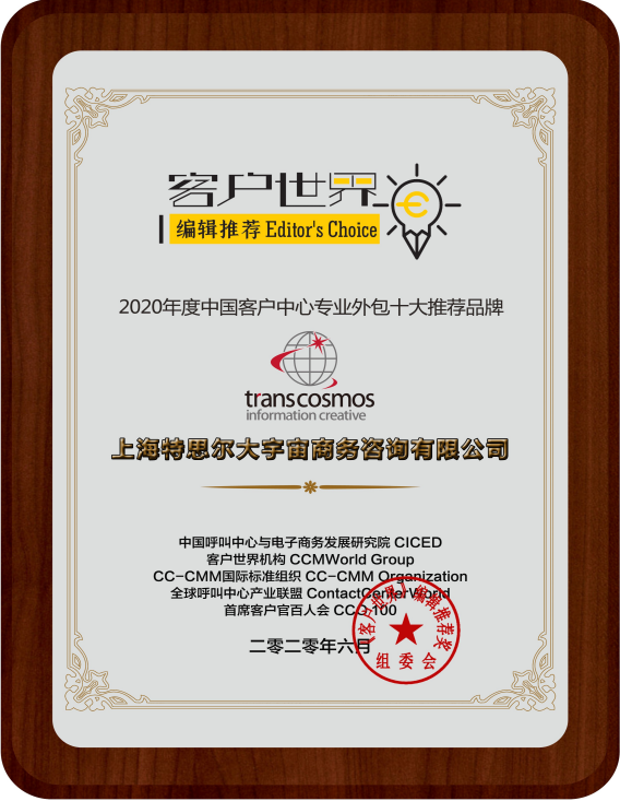 转载请注明来源:transcosmos China斩获《客户世界》编辑推荐“2020年度中国客户中心专业外包十大推荐品牌”