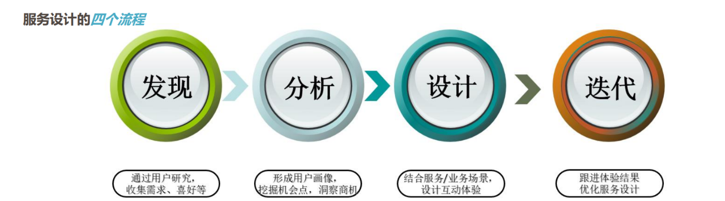 如果要用一套流程来指导服务设计的工作,一般分为四个步骤:发现、分析、设计、迭代(图1)。