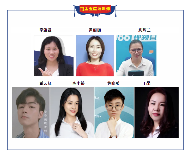 铂金宝藏培训师:李盈盈、黄丽丽、姚辉兰、戴云钰、黄晓彤、陈小裕、于晶