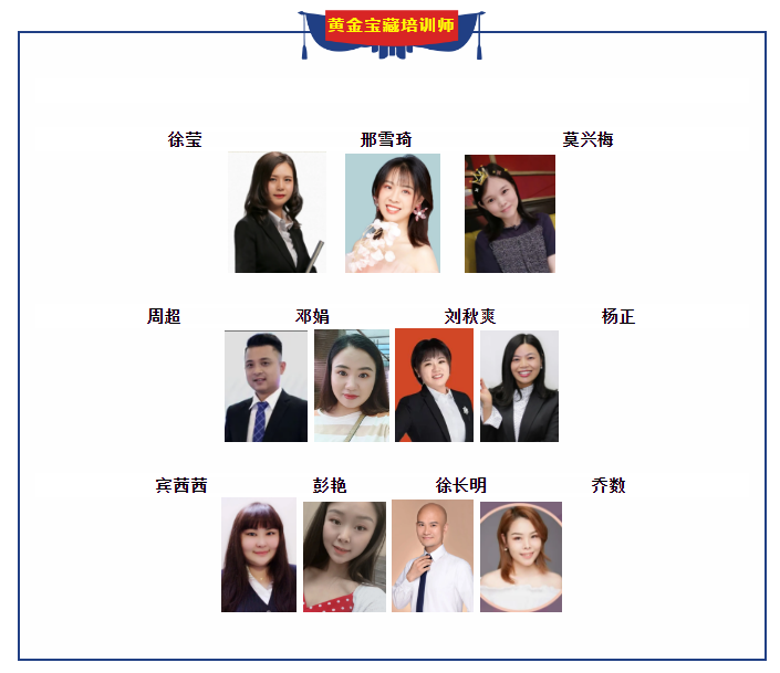 黄金宝藏培训师:徐莹、邢雪琦、莫兴梅、周超、邓娟、刘秋爽、杨正、宾茜茜、彭艳、徐长明、乔数
