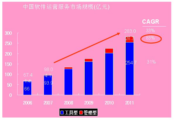 2006中国软件运营服务(SaaS)产业的规模为68亿元,2011年将突破400亿,达到406亿元,未来五年的复合增长率达到43%。这是国内ICT领域权威研究机构计世资讯(CCW Research)在其最新发布的《软件业的下一个十年——中国软件运营服务(SaaS)市场发展趋势研究报告》中指出的。