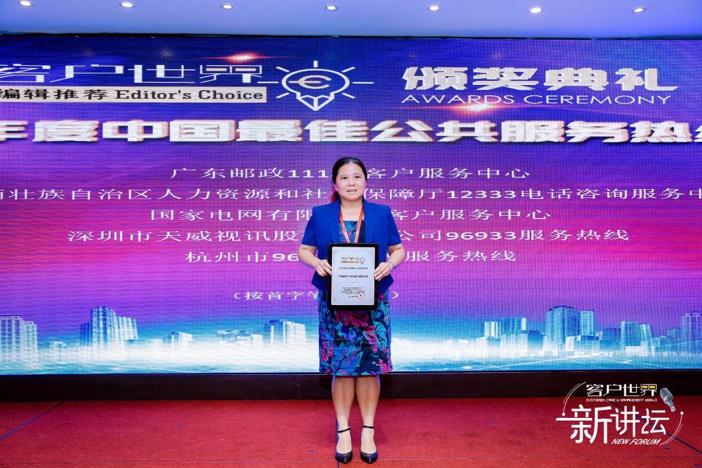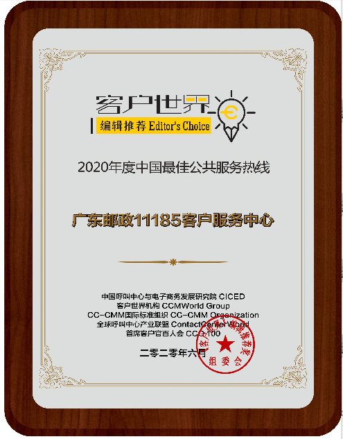 广东邮政11185客户服务中心荣获《客户世界》编辑推荐:2020年度中国最佳公共服务热线。