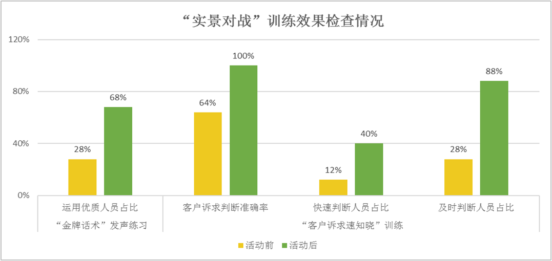 目前行业中对员工沟通能力的改善提升,普遍采用“业务培训、考试验证、质检跟踪”等措施进行,运用到实际接听工作中的成效不够显著。基于此,我们在加入“实战演练”关键措施的基础上,不断丰富培训内容,强化效果持久性。