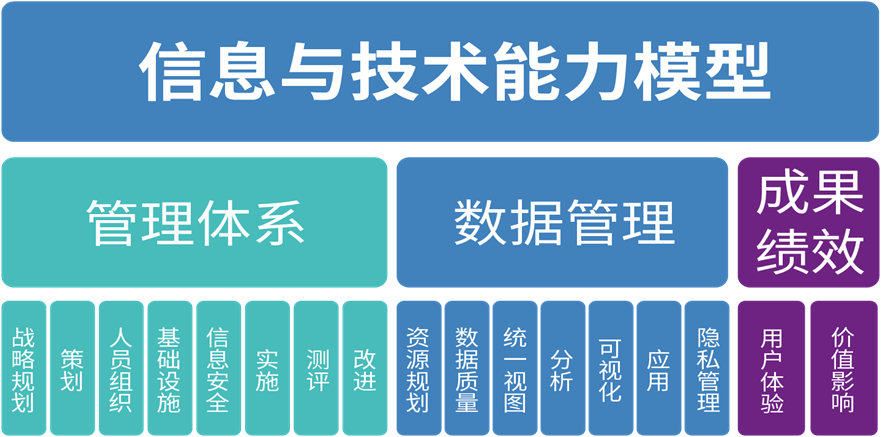 信息与技术能力模型的目的是衡量组织的客户管理中的信息与技术管理体系能力、数据管理能力,以及信息与技术应用带来的成果绩效。