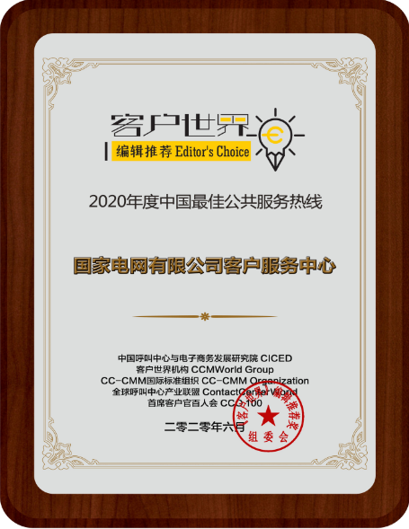 国家电网客户服务中心荣获《客户世界》编辑推荐:2020年度中国最佳公共服务热线。