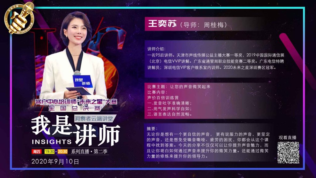 【我是讲师(第2季)】的主题是:为培训师加油;同时也是2020第二届客户中心培训师“未来之星”大赛-全国总决赛的比赛环节。直播课堂将采用师徒制的方式,在辅导老师的全面指导下,通过自选主题/一小时直播和互动答疑的方式,展示培训师全面的能力和个人风采。9月10日19:30-20:30,总决赛第四位选手是:来自中国电信深圳分公司的王奕苏,她同时也是本届大赛-深圳赛区的冠军选手;辅导老师是周桂梅。