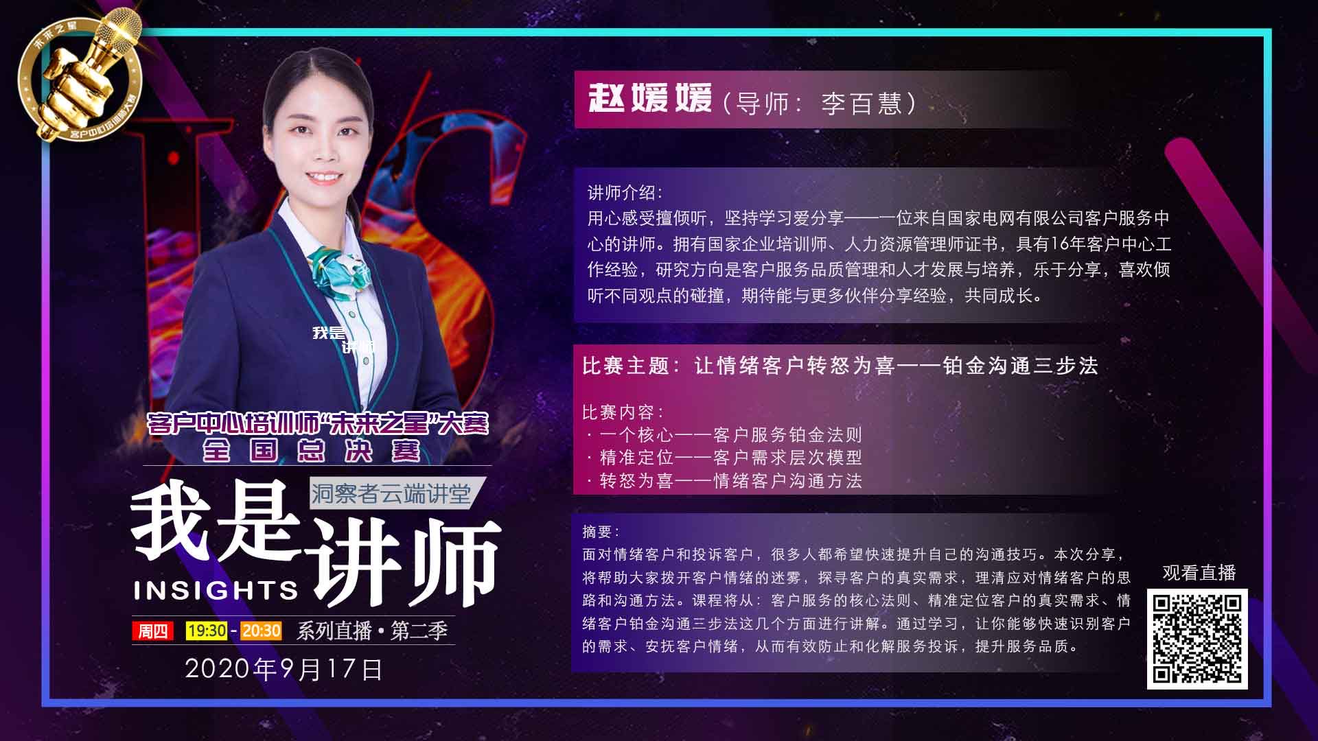 【我是讲师(第2季)】的主题是:为培训师加油;同时也是2020第二届客户中心培训师“未来之星”大赛-全国总决赛的比赛环节。直播课堂将采用师徒制的方式,在辅导老师的全面指导下,通过自选主题/一小时直播和互动答疑的方式,展示培训师全面的能力和个人风采。9月17日19:30-20:30,总决赛第五位选手是:来自国家电网客服中心南方分中心的赵媛媛;辅导老师是李百慧。