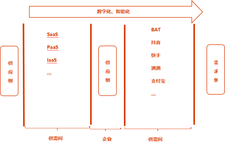 最容易想到的是从交易两侧看,即从供需两个角色出发,其逻辑是客户如果转向数字化,那么商家必须跟上,或者客户不变,商家做数字化创新,更好地满足需求,以供需两方视角理解没问题,大家一说起商业,很容易理解为供应侧和需求侧,生意就是供需之间随着环境和技术变化的互动。
