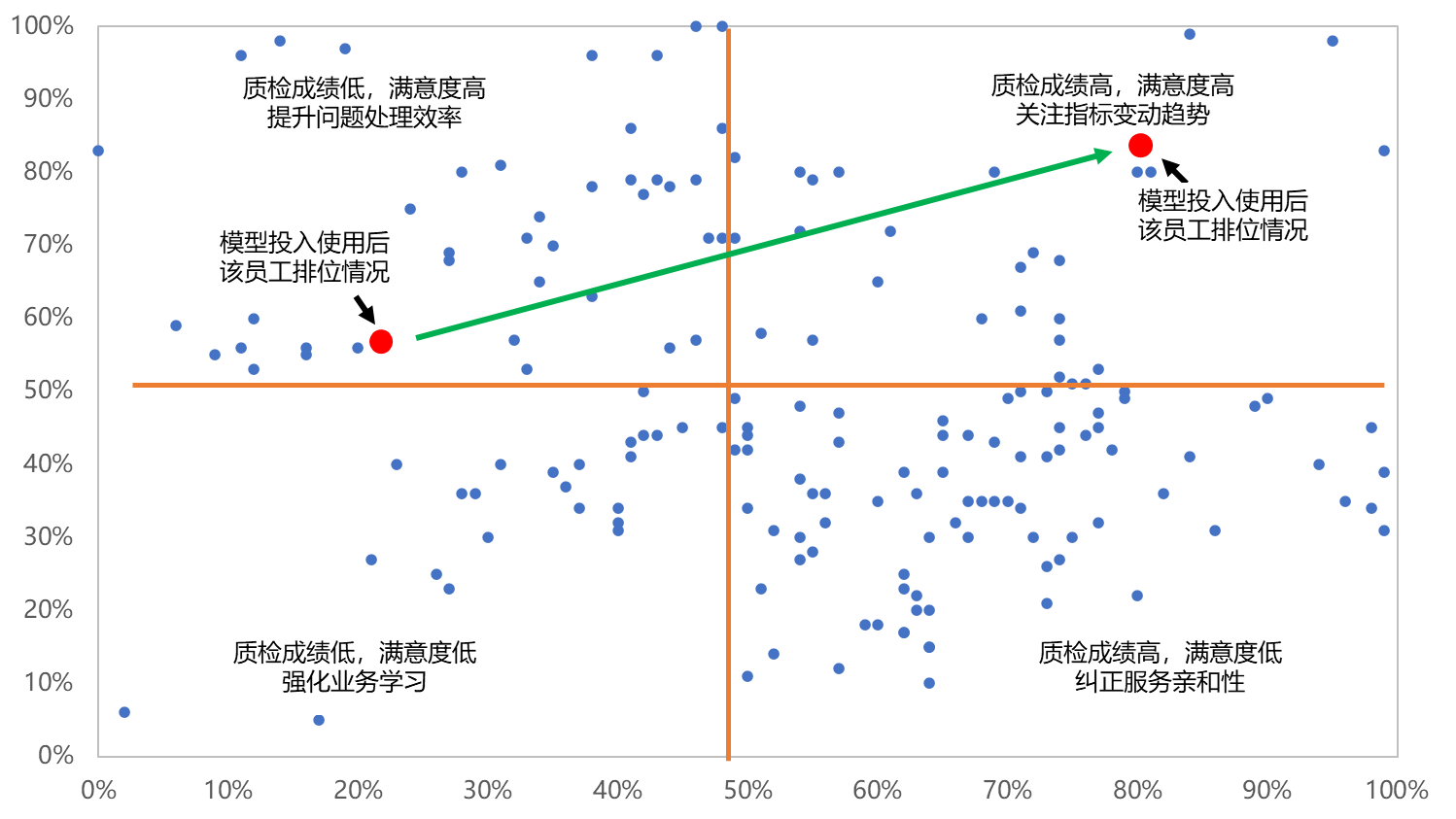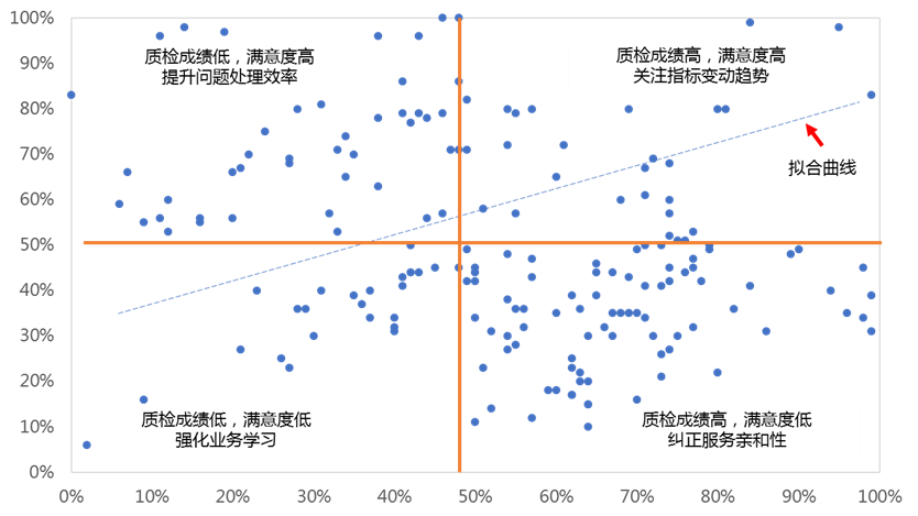 以某员工服务质量数据为例,该员工在数字化运用举措投入使用前质检成绩高于30%员工,满意度高于55%员工,质检和满意度均不属于亟需提升的范畴,按常规服务质量管理“抓重点、照顾一般”策略,管理人员不做过多介入。模型投入使用后,根据模型中的散点图,识别出该员工处于“满意度高,质检低”的象限内,需要大力提升问题处理效率,武汉分中心因人施策,针对该类员工加大业务培训力度,最终该员工经过1个月的强化训练质检成绩大幅提升,质检成绩超越80%员工,话后满意度首次达到100%,进入“满意度和质检双高”的象限,并一直保持(图5)。