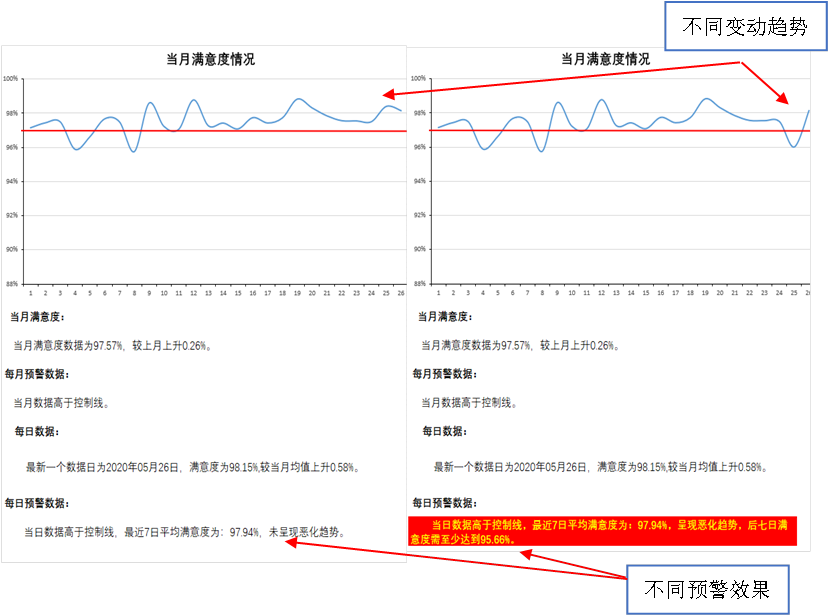设计较完善的数学模型,通过大数据分析统计方式,对历史数据进行科学的回归分析和预测,对变动趋势异常(有下滑倾向)的个人(班组)高亮标示,提醒管理人员关注异常的个人(班组),管理人员可在服务质量大幅下降前主动采取提前介入措施,有效遏制服务质量下滑趋势,将服务质量管理从事后处理变为事前预警和事中控制,实现管理前置(图2)。